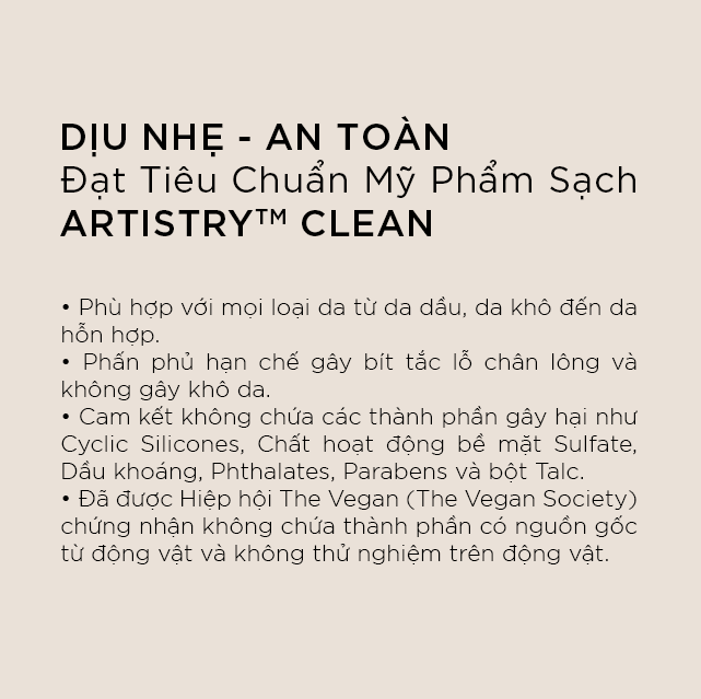 Sản phẩm đạt tiêu chuẩn Mỹ phẩm Sạch Artistry Clean và được Hiệp hội The Vegan (Vegan Society) chứng nhận không chứa thành phần có nguồn gốc từ động vật và không thử nghiệm trên động vật.